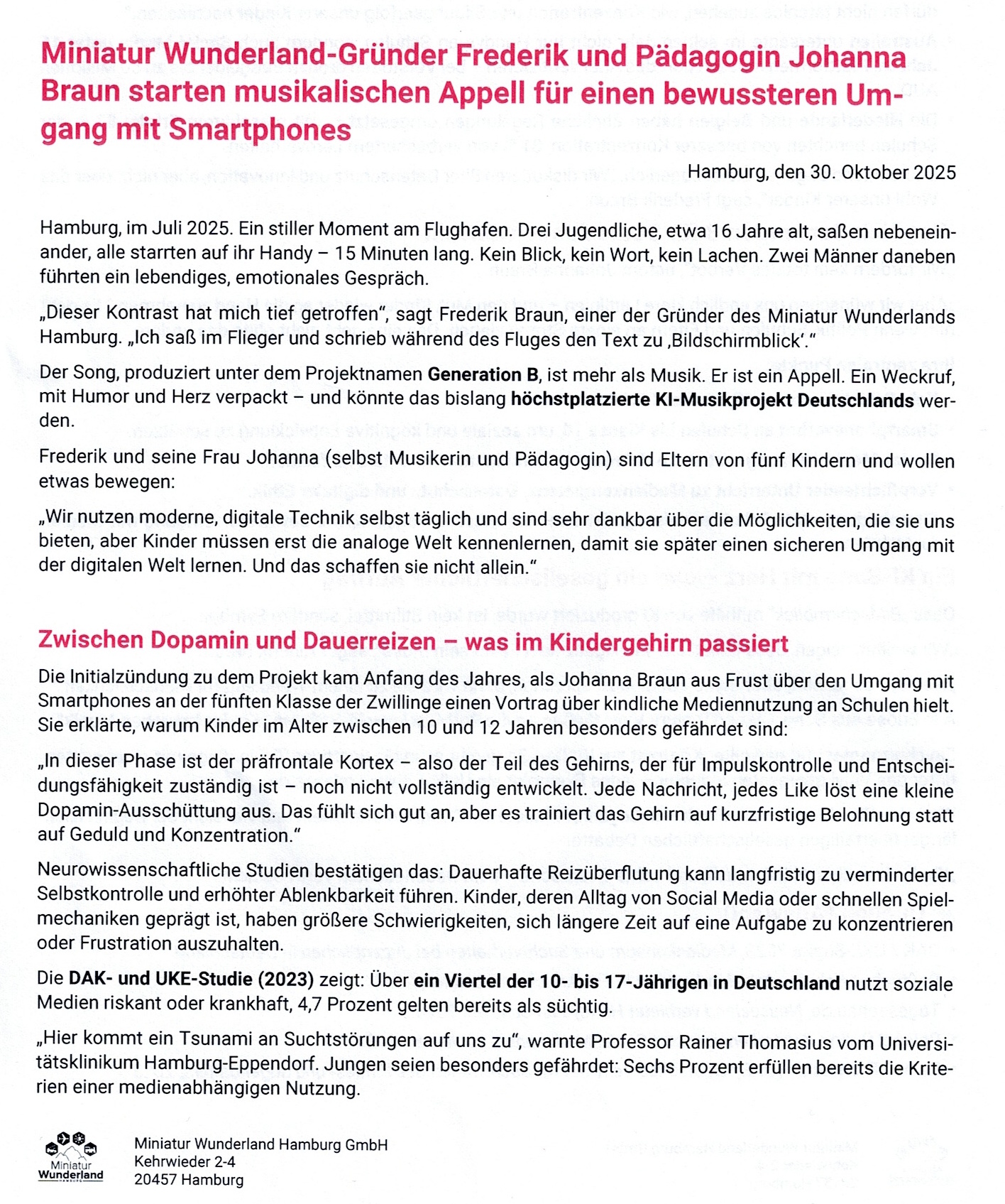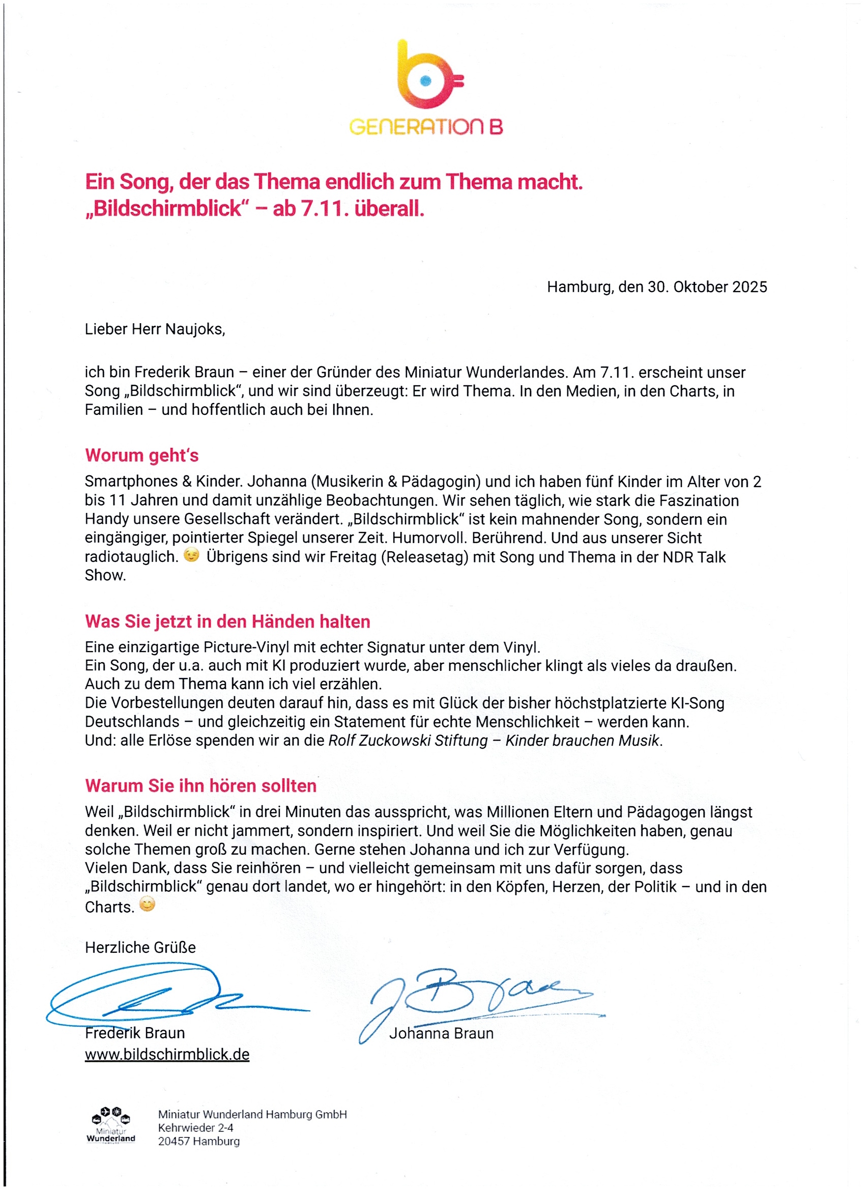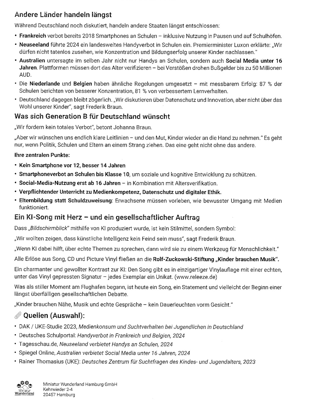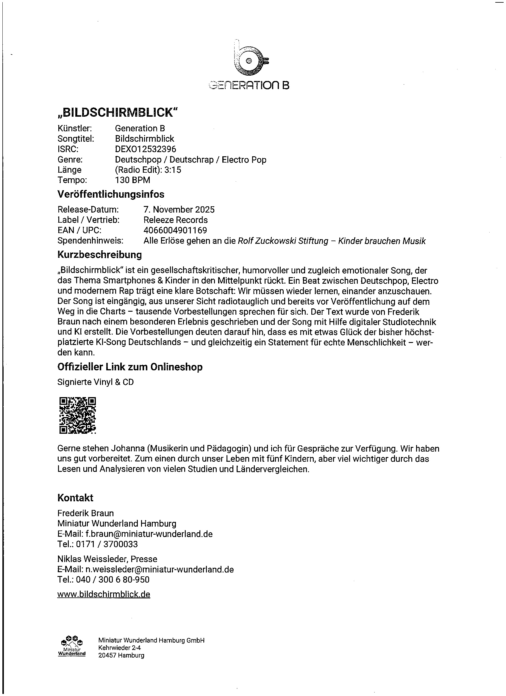 Und sie haben mit "Bildschirmblick" einen gesellschaftskritischen, humorvollen und zugleich emotionalen Song geschaffen, der das Thema "Smartphones & Kinder" in den Mittelpunkt rückt und eine klare Botschaft trägt: Wir müssen wieder lernen, einander anzuschauen.